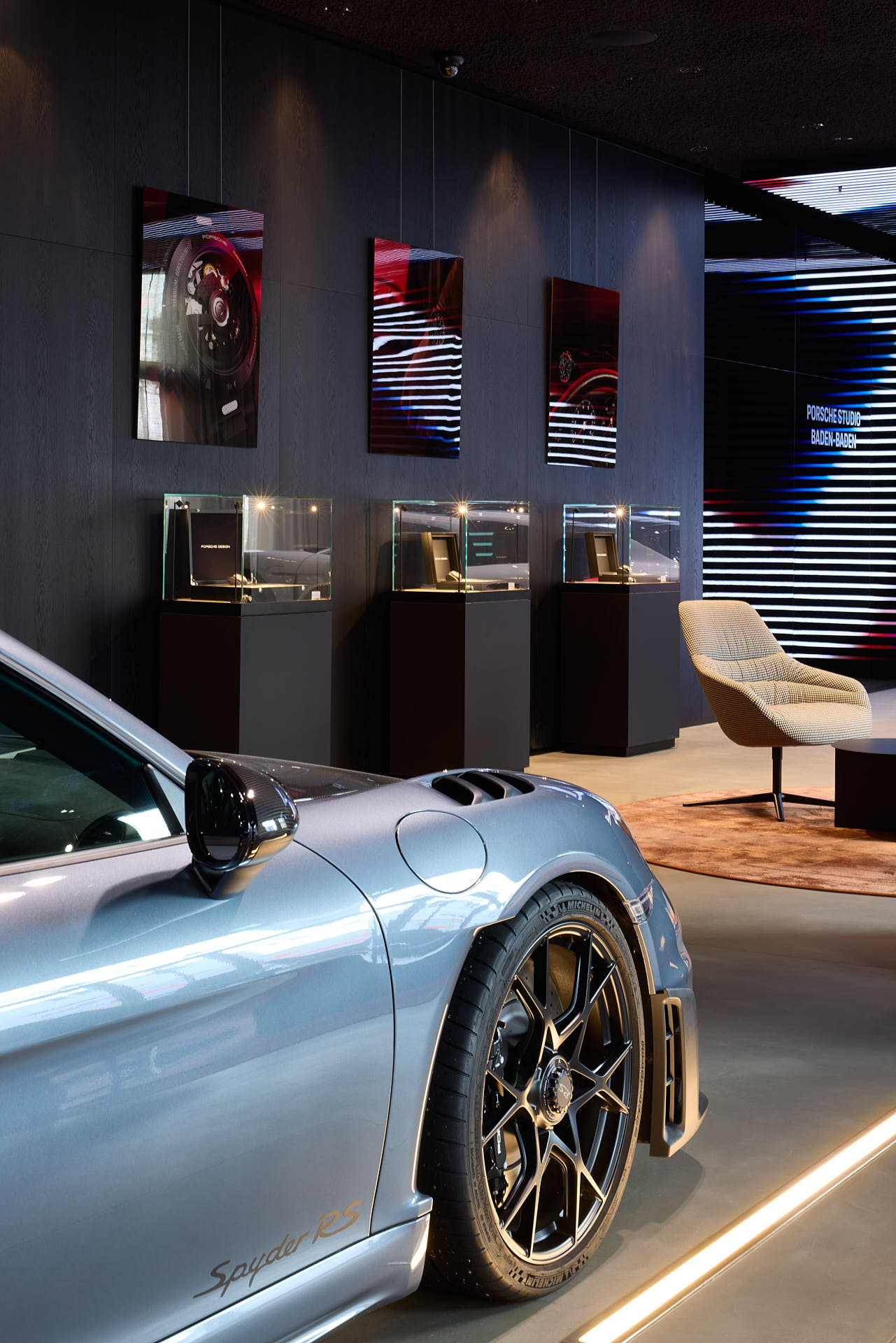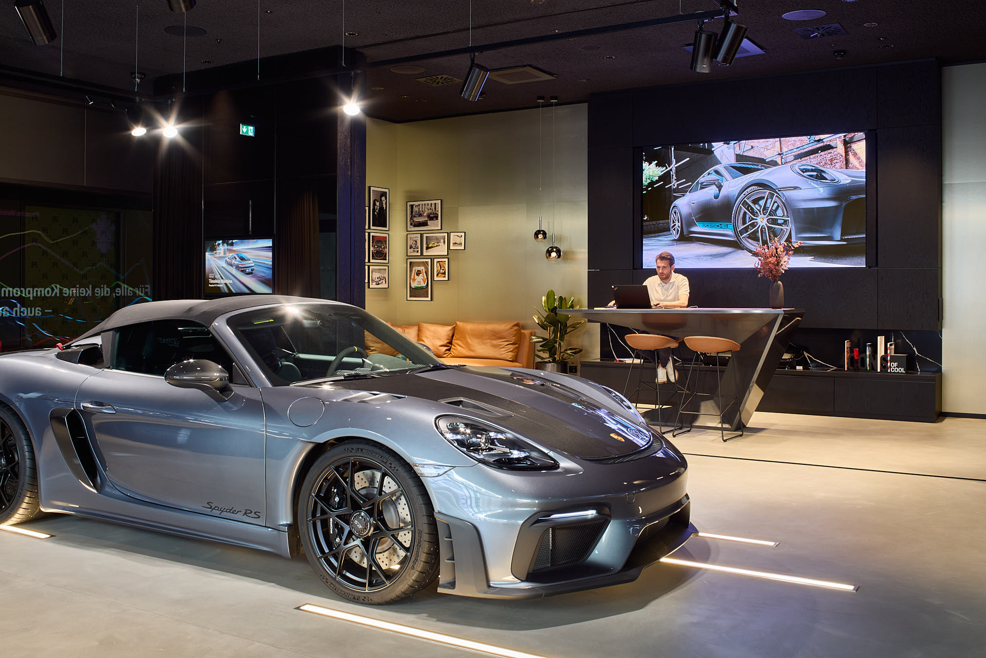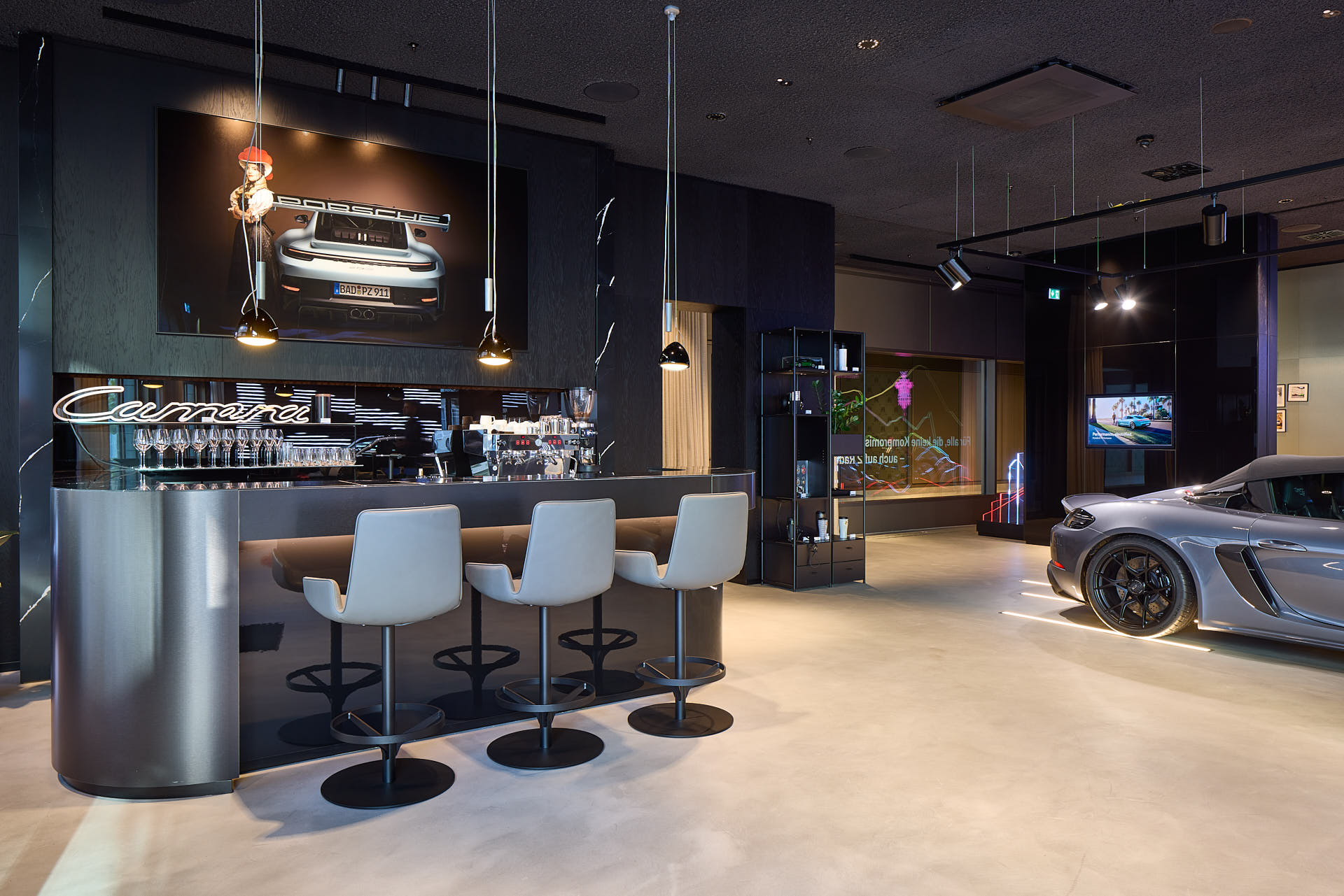 Eröffnung des ersten Porsche Studios in Deutschland – Architektur trifft auf Performance und Lifestyle Mit dem innovativen Retail-Format setzt Porsche neue Maßstäbe in der Verbindung von Mobilität, hochwertigem Lifestyle und inspirierendem Design – mitten im urbanen Raum. Das rund 300 Quadratmeter große Studio wurde von unserem Team ganzheitlich konzipiert: von der Architektur über das Interior Design bis hin zur Ausführungsplanung und Umsetzung. Das Ergebnis ist ein atmosphärisch durchdachter Ort, der das Markenerlebnis Porsche neu definiert – unter dem Leitsatz „made for friends“. Ein Ort für starke Auftritte – und starke Eindrücke Zentraler Bestandteil des Studios ist die Lichtgarage, die Fahrzeuge mit Animationstechnik und Soundeffekten emotional in Szene setzt. Neben diesem Highlight bietet das Studio eine Executive Lounge für individuelle Fahrzeugkonfigurationen, eine einladende Bar sowie eine kuratierte Auswahl hochwertiger mechanischer Uhren der Marke Porsche – alles in einem Umfeld, das Präzision und Stil ausstrahlt. Das Interior greift charakteristische Elemente aus der Porsche-Welt auf: Auserlesene Materialien wie weiches Leder, hochwertiges Holz und Lounge Chairs mit dem ikonischen Pepita-Muster des Porsche 911 aus den 1960er-Jahren schaffen eine Verbindung zwischen Tradition und Moderne.